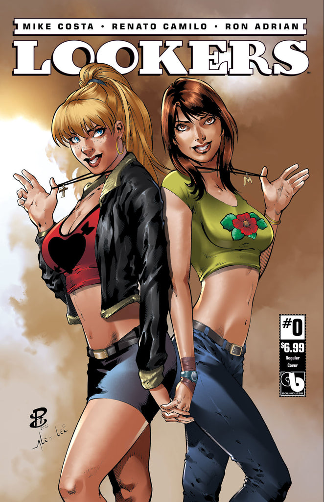 PRODUCT DESCRIPTION: A giant 80 page debut issue! Mike Costa delivers a new generation of bad-ass babes in the debut of Lookers! The twenty year-old title gets a fresh launch as twenty year-old sister Michelle and Tanya take down 21st century trolls.Tanya has no inhibitions and Michelle has a violence addiction – but together they help people that are violated in the cyber world. Fresh off the heels of Belladonna, Costa delivers another smoking hot new Boundless series that is a high octane romp through online sex shows and fast powerful women! Lookers is a sultry modern version of Charlies Angels run by Hugh Hefner! This ultra-size issue also features the complete classic Lookers / Pandora graphic novel epic, in color for the first time!