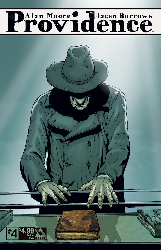 PRODUCT DESCRIPTION:  Alan Moore’s horror event of the year continues to push the limits of the comic book medium with an incredible ad-free 40 page fourth issue!  Robert Black's journey into the heart of the USA in 1919 continues as he finds the citizens of Salem to be most interesting. This work has been researched and developed by Moore and Burrows over the course of several years.  The end result is an amazing tome of Lovecraftian influenced nightmares where Moore has written every cover, every single page, and every nuance of this work to create his most fully-realized vision to date.  Fans of Moore’s immersive style and meticulous grasp of storytelling will be thrilled to add this essential piece of comics history to their collections!  Available with Regular, Pantheon, Portrait, Dreamscape Wraparound, Women of HPL, and a special Ancient Tome Incentive cover, all by collaborator Jacen Burrows.