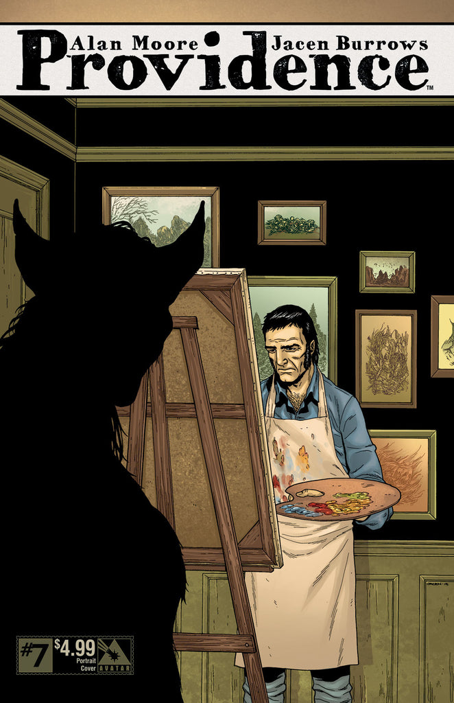 PRODUCT DESCRIPTION: Robert Black came looking for a story but what he found is a world of misery and woe. He's become a broken man only beginning to accept the horrors of the Lovecraftian world are real and hiding in plain sight. Alan Moore and artist Jacen Burrows have delivered a slow burn tale of fear and underlying dread that has delighted fans and scholars alike. Moore has written every cover detail, every single page, and every nuance of this work to create his most fully-realized vision to date. Fans of Moore’s immersive style and meticulous grasp of storytelling will be thrilled to add this essential piece of comics history to their collections! Available with Regular, Pantheon, Portrait, Dreamscape Wraparound, Women of HPL, and a special Ancient Tome Incentive cover, all by collaborator Jacen Burrows.