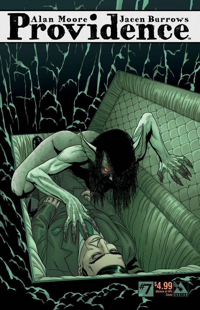 PRODUCT DESCRIPTION: Robert Black came looking for a story but what he found is a world of misery and woe. He's become a broken man only beginning to accept the horrors of the Lovecraftian world are real and hiding in plain sight. Alan Moore and artist Jacen Burrows have delivered a slow burn tale of fear and underlying dread that has delighted fans and scholars alike. Moore has written every cover detail, every single page, and every nuance of this work to create his most fully-realized vision to date. Fans of Moore’s immersive style and meticulous grasp of storytelling will be thrilled to add this essential piece of comics history to their collections! Available with Regular, Pantheon, Portrait, Dreamscape Wraparound, Women of HPL, and a special Ancient Tome Incentive cover, all by collaborator Jacen Burrows.