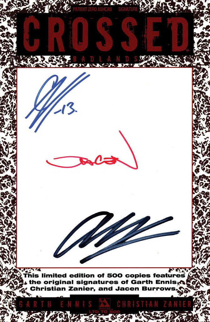 - The Crossed Patient Zero Ashcan Signature Edition triple signed by Garth Ennis, Christian Zanier and Jacen Burrows - that you can only get in this set!