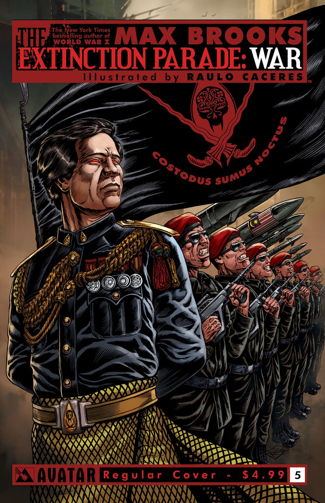 PRODUCT DESCRIPTION:  The final issue of the second series epic conflict erupts into a super-size issue as the Army of the Bloodline is finally revealed!  The war between Vampires and Zombies reaches a critical point as the long rumored Vampire army is finally assembled, preparing for a way to end this War.  New York Times Bestselling Author MAX BROOKS pushes the limits of modern horror to the breaking point in this pivotal chapter in his epic tale of undead class battle.   Extinction Parade will return in 2015 with the third, and final chapter of the most epic conflict ever!  Available with Regular, Wraparound, End of a Species, Leather (limited to just 1000 copies), and Bloodwashed and Pure Art Retailer Order Incentive covers, all by series artist Raulo Caceres.