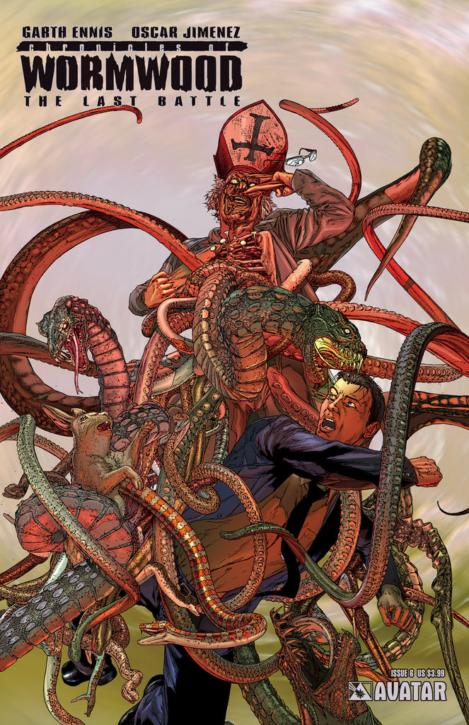 PRODUCT DESCRIPTION: Hell on Earth is here, live, from New York! The final issue of the Last Battle is so epic in scope it has to be super-sized! The recently-departed Pope Jacko is back and determined to rule New York by turning it into a demonic infested Hell. Danny Wormwood is in way over his head with domestic disasters and literal Armageddon seeming closer than ever. Will Jay be able to rise to the challenge and help, or he is pretty content to sit in the bar and drink? Series artist Oscar Jimenez provides the stunning cover and interior art. Ennis drags the whole world into the gutter with his trademark razor-sharp dialogue, biting wit, and the stunning art of Jimenez, all in full-color. This final issue is available with Regular and Visions of Hell Wraparound, both by series artist Jimenez, and special retailer incentive Anti-Christ Edition!