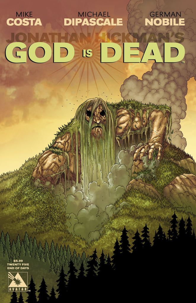 PRODUCT DESCRIPTION:  A perfect jump-on point with a series recap, super-size issue, and new story arc!  After all the Earth has been through, after all the pantheons have done to each other, after all the centuries of hate have boiled to the surface, what could possibly unite the Gods of old?  Something unspeakable is coming to this devastated planet.  Series author Mike Costa opens a World-shattering new story arc as the worst fears of the most powerful deities come true - the Titans have returned!  More powerful than ever, and with horrific giant beasts at their bidding, the Titans are back and plan to eliminate the Gods once and for all!  Don’t miss the epic new direction for God Is Dead beginning right here in this oversized book of dread.  Available with a Regular, End of Days, Iconic and  Gilded Retailer Incentive covers by Jacen Burrows, a Carnage Wraparound cover by German Nobile, and a special Enchanting cover by Gardenio Lima.