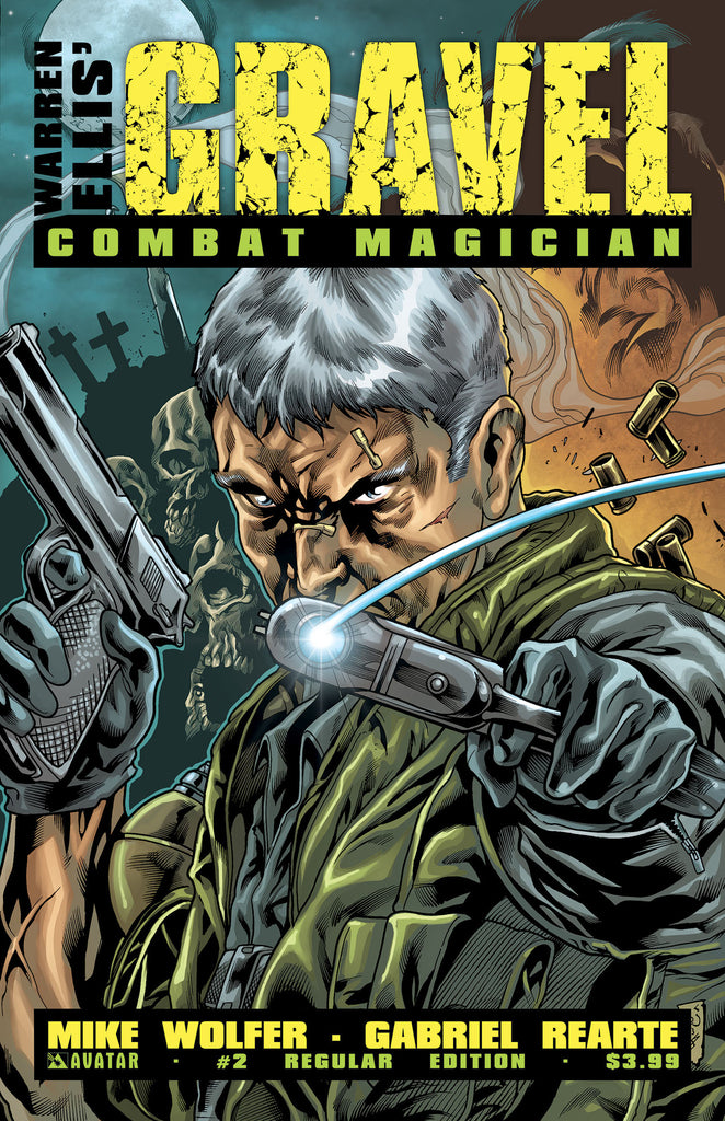 PRODUCT DESCRIPTION: The monthly adventures of William Gravel continue! Pressed into military service after his release from prison, Gravel finds that much has changed since his incarceration. Not only has the Combat Magician program for which he once instructed been practically abandoned by the British S.A.S., but the recruits who graduated the program have been less than stellar applicants, and none of them properly trained. Meanwhile, one man has turned the Tokyo subway system into his own personal abattoir, and it appears to be done using combat magic! Available with a Regular cover by Uber artist Caanan White, Wraparound, Horror and a Black Magic Order Incentive cover by Mike Wolfer.
