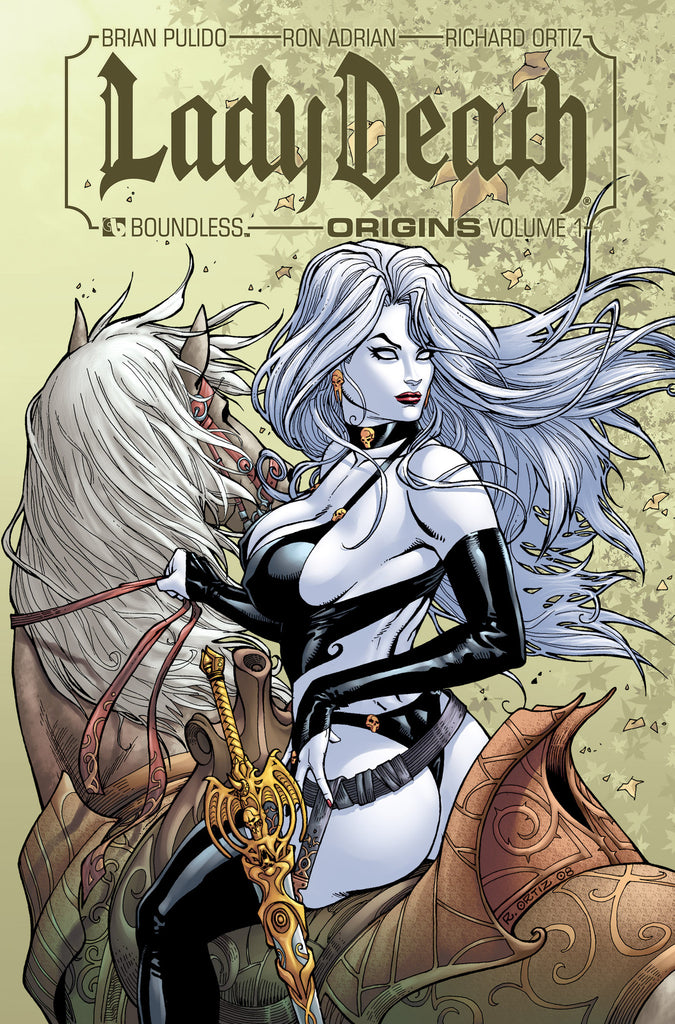 PRODUCT DESCRIPTION: Limited to 1250 copies. For the first time ever, Lady Death's previous tales are being collected in this new series of graphic novels, Lady Death: Origins! With tons of breathtaking adventures that are, until now, out of print, the Lady Death: Origins series is a perfect way for fans to see what has come before the new Boundless monthly series! This first volume collects the epic five-issue Abandon All Hope series, which not only tells Lady Death's origin story, but introduces a whole cast of characters, with art from Ron Adrian. Also contained within is the two-issue Wicked series with art by Richard Ortiz. This volume is available in paperback with a cover by Javier (Crossed) Barreno, a Hardcover by Juan Jose Ryp that is limited to 2500 copies, and a special Signed Hardcover with a new cover from Richard Ortiz and featuring a signature plate from creator and writer of Lady Death, Brian Pulido that is limited to 1250 copies!