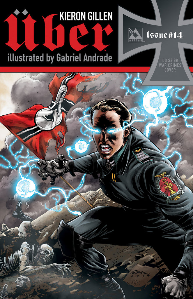 PRODUCT DESCRIPTION: KIERON GILLEN and GABRIEL ANDRADE have brought an incredible visceral bloody misery to the pages of “Uber Year II.” The Russians have a monster. Katyusha has activated and appears to be Battleship class. But she was already a wild card, uncontrollable and unstable. How can they hope to base their military survival upon the shoulders of a psychotic soldier? The German Ubers continue to push their advantage in the world theatre and the ground quakes from their titanic powers. Casualties continue to mount in a conflict that is quickly sending the world to the brink of utter destruction. Available with Regular, War Crimes, and Wraparound covers by Gabriel Andrade, Propaganda Poster cover by Michael Dipascale, and a special Blitzkrieg Incentive cover also by Andrade