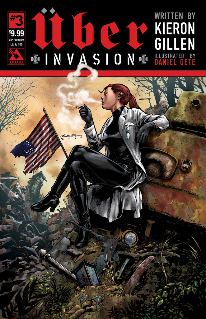 PRODUCT DESCRIPTION: The USA is on fire. Germany’s master plan has struck at the very heart of the remaining Allied power. And now as the West burns alongside Europe, hope that this miserable conflict will end fades away. It seems that global dominance is within the reach of the Nazis. Can anyone turn the tides or is this the final wheezing gasp of a world on the precipice of expiring? Available with Regular, Wraparound, War Crimes, and Blitzkrieg covers by series artist Daniel Gete, a painted Propaganda Poster cover, and a limited VIP Premium cover by Gabriel Andrade that is limited to 500 copies!