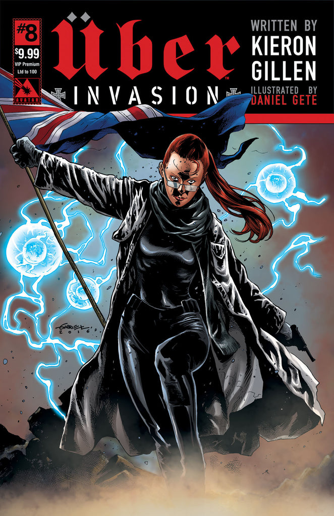 PRODUCT DESCRIPTION: Patton is on the offensive! Uber-powered and ready to stick it to the Hun, the general is tired of sitting on the sidelines and launches a crafty attack from Italy. Meanwhile, the Americans have two fronts now, with San Diego in ruins as well as the East Coast burning. Available with Regular, Wraparound, War Crimes, Propaganda and Blitzkrieg covers by series artist Daniel Gete and a limited VIP Premium cover by Gabriel Andrade that is limited to 500 copies!