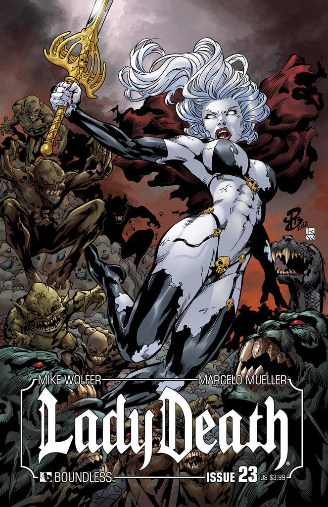 PRODUCT DESCRIPTION: Lady Death's nightmarish voyage of discovery within The Void continues, and takes a most unexpected and unimaginable turn! With the heart-wrenching turmoil of her original sacrifice still fresh in her mind, Hope and her two closest allies must fight for their lives against an enormous, undead, two-headed dragon, but the real battle is yet to be waged. Are you prepared for the return of Death Queen…? Available with Regular cover by Renato Camilo, Sultry cover by Juan Jose Ryp, and Wraparound and order incentive Art Deco cover by painter Michael Dipascale!