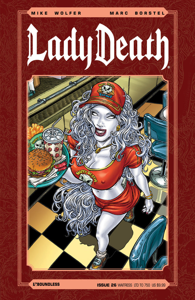 PRODUCT DESCRIPTION: At long last, the rumored Lady Death #26, the final issue of the previous series,  is available, but act fast as every cover is limited! Transformed by the forces of The Void into the embodiment of Death itself, Hope is about to be put to the test in a most horrifying manner. Lying in ruins and abandoned for nearly a decade, Castle Death beckons, but Lady Death finds that it is anything but deserted, as deadly apparitions of those she has slain haunt it and cry out for vengeance.  Available with Regular cover by Pow Rodrix (limited to 3000 copies), Wraparound (limited to 2000 copies) and Sultry (limited to 1350 copies) covers by Renato Camilo, Auxiliary (limited to 1000 copies), French Maid (limited to 750 copies) and Waitress (limited to 750 copies) by Juan Jose Ryp and incentive Art Deco cover by painter Michael Dipascale!
