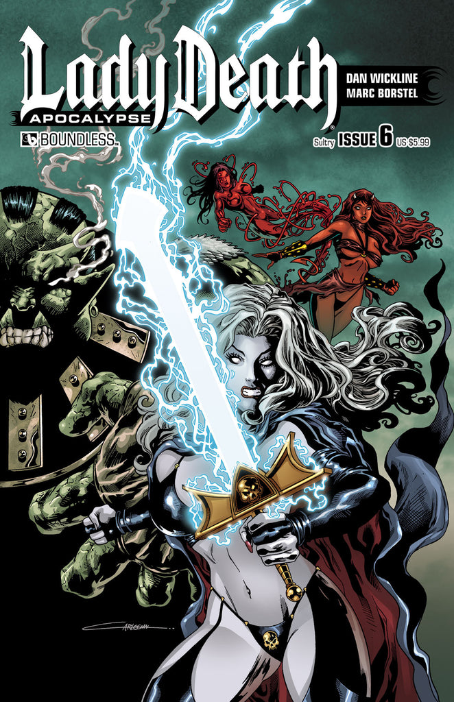 PRODUCT DESCRIPTION:    Apocalypse wraps up in this stunning oversized final issue!  All stands revealed as we see that Satyricon has been pulling Queen Tormina’s strings in an effort to destroy the Blacklands. Now only Lady Death stands in his way. Will her new found powers from The Void be enough to stop the mad demon’s apocalyptic quest? This is the final fate of the Underrealm and Lady Death. Also featuring a special pinup and behind-the-scenes gallery of art from Lady Death through the ages!  Available with Regular, Auxiliary,  Alternate History, and Pure Art  Covers by Juan Jose Ryp, Wraparound by Gabriel Rearte, Sultry by Marcelo Mueller, and a Classical Order Incentive Cover by Marco Turini.