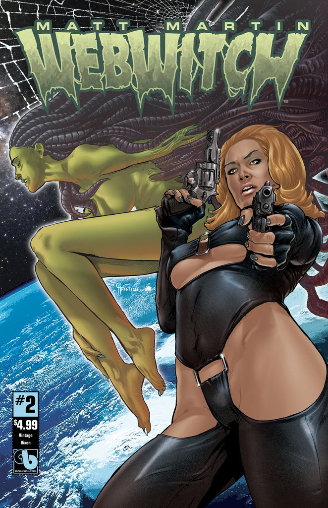 PRODUCT DESCRIPTION: The heat turns up in this giant-sized second issue! Matt Martin’s Webwitch is a sexy horror tour de force that takes fans on a powerful thrill ride through of super-spies and sultry aliens! Nina has to deal with the curse of her alien DNA and now the fate of the creepy Spider-Nation and all of humanity rests upon her shoulders. We also continue the full-color presentation of Tim Vigil's Webwitch series! Don't miss the amazing array of luscious covers with this issue including Regular, Wraparound, Honey Trap, and a Retailer Incentive Pure Art by Matt Martin and Alien Seduction cover by Karl Waller. Christian Zanier illustrates the Vintage Vixen (a homage to sexy spies of the past) and the ultra-collectable Costume Change 6 cover set (with sexy topless and nude covers included!) that is limited to just 250 sets.
