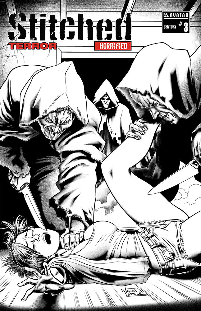 This set comes with digital copies of all issues, and a digital omnibus of all the prior issues of Stitched! Now we get into the real gems – the HORRIFIED editions! Each HORRIFIED issue has an eight page added section that will not be seen in regular versions , nor will this content be available in any digital editions. These special bonus pages feature unedited, ultra-intense versions of covers , dripping with gore, nudity, and the tasty bits we had to edit for the covers. These are the the pure, visceral visions of the artists, never-before-seen! These are made even cooler by their extreme rarity – only 1000 copies in total on each issue have these extra pages! This set has all nine of the Horrified editions we will offer to lower levels. This top reward level also has three awesome Century editions showing the luscious gray tones of Nahuel Lopez and these are the last Horrified editions, so you would have all twelve of the editions on all three Horrified issues!