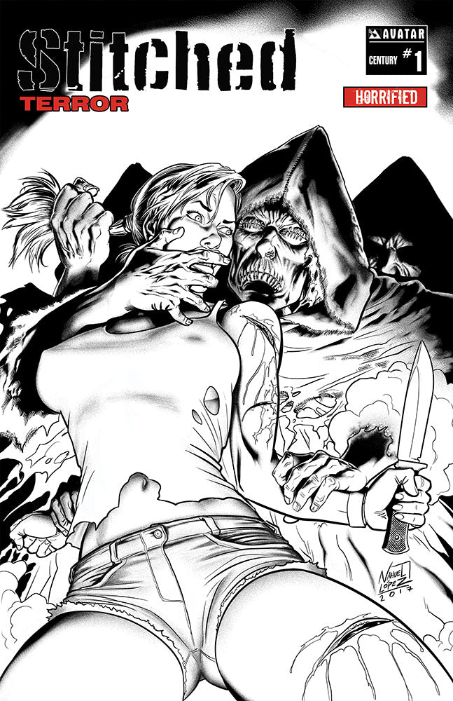 This set comes with digital copies of all issues, and a digital omnibus of all the prior issues of Stitched! Now we get into the real gems – the HORRIFIED editions! Each HORRIFIED issue has an eight page added section that will not be seen in regular versions , nor will this content be available in any digital editions. These special bonus pages feature unedited, ultra-intense versions of covers , dripping with gore, nudity, and the tasty bits we had to edit for the covers. These are the the pure, visceral visions of the artists, never-before-seen! These are made even cooler by their extreme rarity – only 1000 copies in total on each issue have these extra pages! This set has all nine of the Horrified editions we will offer to lower levels. This top reward level also has three awesome Century editions showing the luscious gray tones of Nahuel Lopez and these are the last Horrified editions, so you would have all twelve of the editions on all three Horrified issues!