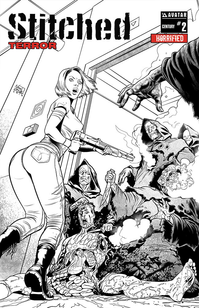 This set comes with digital copies of all issues, and a digital omnibus of all the prior issues of Stitched! Now we get into the real gems – the HORRIFIED editions! Each HORRIFIED issue has an eight page added section that will not be seen in regular versions , nor will this content be available in any digital editions. These special bonus pages feature unedited, ultra-intense versions of covers , dripping with gore, nudity, and the tasty bits we had to edit for the covers. These are the the pure, visceral visions of the artists, never-before-seen! These are made even cooler by their extreme rarity – only 1000 copies in total on each issue have these extra pages! This set has all nine of the Horrified editions we will offer to lower levels. This top reward level also has three awesome Century editions showing the luscious gray tones of Nahuel Lopez and these are the last Horrified editions, so you would have all twelve of the editions on all three Horrified issues!