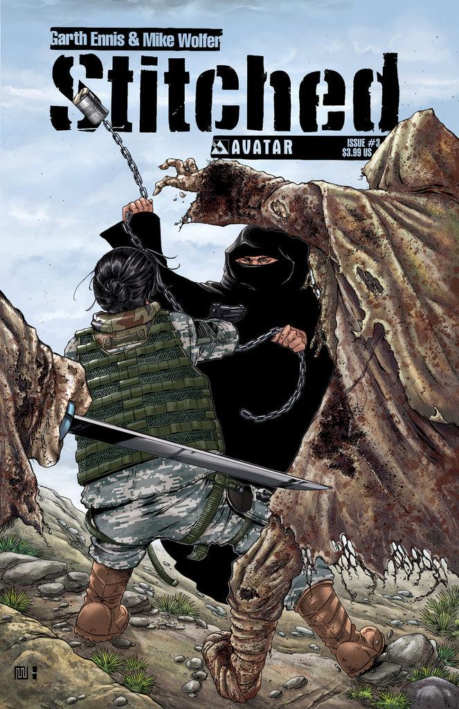 Format: Full Color, 32 pages, monthlyUPC : 8200230076773011PRODUCT DESCRIPTION : Garth Ennis continues the epic modern horror story that unleashes a new kind of monster! The crew of a downed American Blackhawk and the SAS team who they were charged with extracting begin their long walk through enemy territory. But no soldiers have ever faced adversaries quite like the ones who wait in the Afghanistan desert, twisted remnants of tortured human corpses reanimated by black magic and intent of murdering every living thing within their grasp. As the mystery of the Stitched deepens and their attacks come more unexpectedly, a few tantalizing clues to their creation begin to unfold, but it's a truth that's almost too unbearable to believe. This new on-going series is certain to appeal to Ennis' legions of fans as it pushes the envelope of horror beyond the boundaries of sanity and into fresh nightmares.  Stitched #3 is available with a Regular cover, Wraparound cover, and Gore cover by series artist Mike Wolfer, and a special Stitched Movie Photo cover retailer incentive cover.