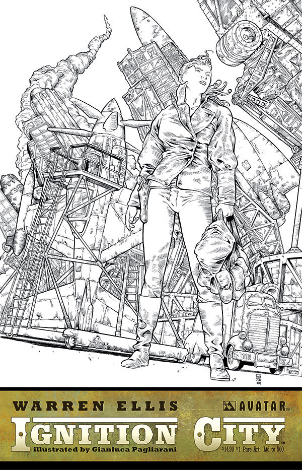 PRODUCT DESCRIPTION: This Pure Art edition features the original cover art of Ignition City #1 in pure black & white so you can fully appreciate every luscious line Gianluca laid down. This collectors edition of the hottest series of the year is limited to just 500 copies, all of which ship in a special hard case.