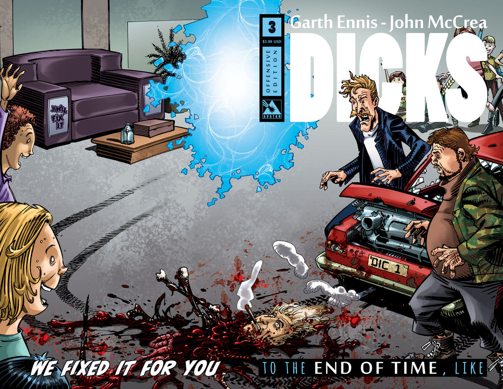 PRODUCT DESCRIPTION: GARTH ENNIS has made amusing readers the highest priority as he and JOHN MCCREA send the Boys from Belfast on a trip through time! The Dicks are here to leave no insult unslung and no offence untaken as they gather artifacts through the ages trying to prevent the end of us all. Or, well, at least prevent a very bad day for a couple folks. Available with Regular, Offensive, and Classic Moment Incentive covers by McCrea.