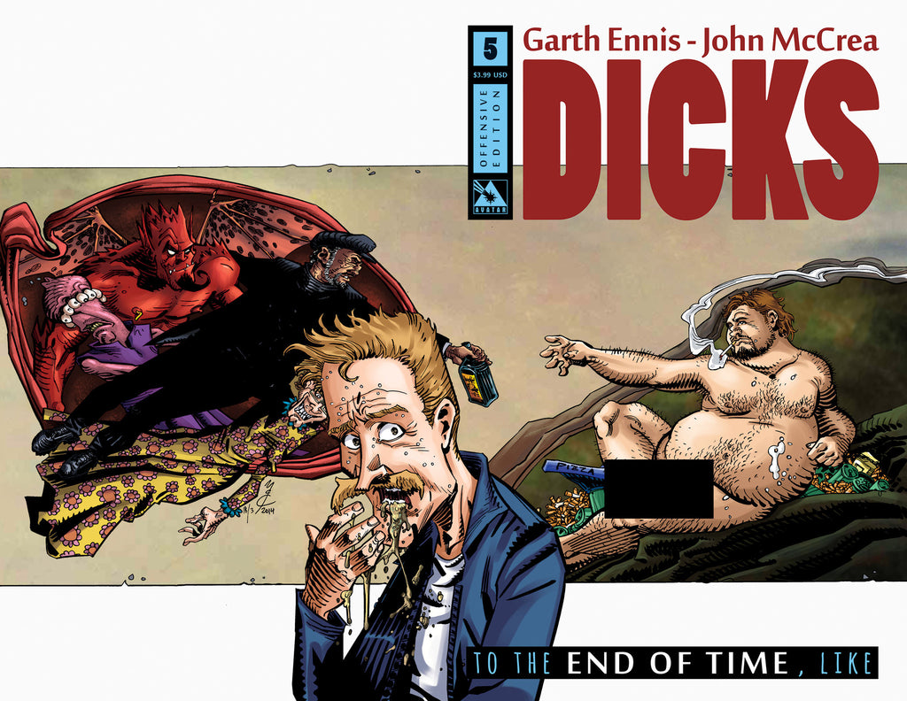 PRODUCT DESCRIPTION:  Dougie and Ivor are men on a mission.  They are out to save everyone in history from the greatest evils and in the process,  insult every comic book reader with the most hilariously offensive antics ever published.  But all of their old foes are gathered against them, how can they hope to defeat the Dong and the Ballacks before the Pope dies in the most horrific of ways?  You'll never know without reading  Dicks: End of Time!  Available with Regular, Offensive, and Classic Moment Incentive covers by series artist John McCrea.